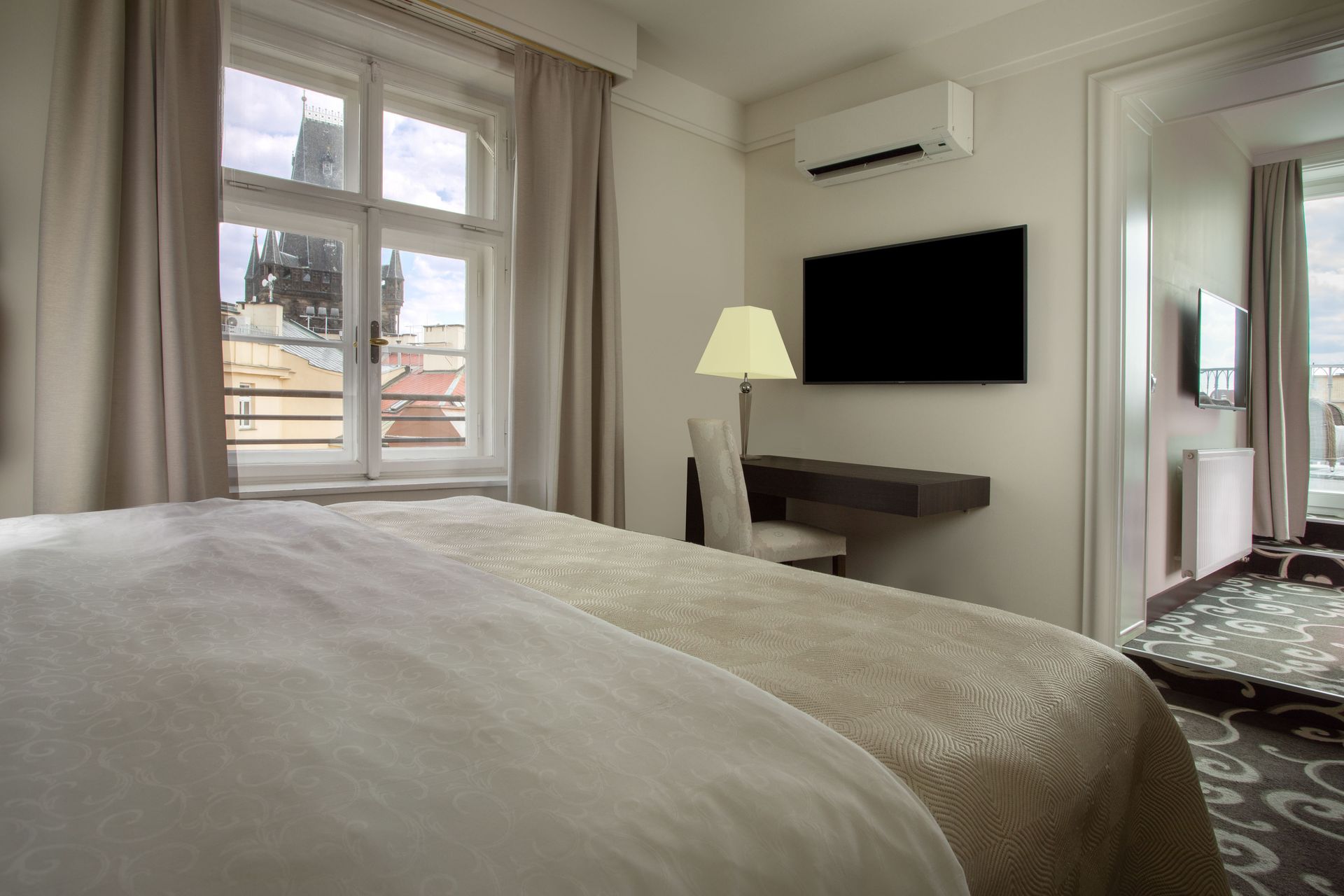 Dvoulůžkové pokoje s výhledem na město, jsou vybaveny elegantním tmavým nábytkem a nabízejí manželskou postel velikosti King nebo dvě oddělené postele.