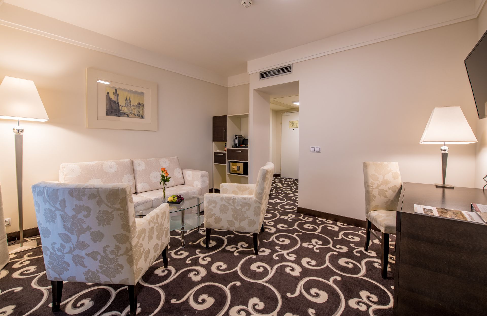 Prostorný Bohemia Suite se nachází v sedmém patře. Kromě oddělené ložnice a obývacího pokoje s rozkládací sedací soupravou nabízí také soukromou terasu s krásným výhledem na Staré Město a Týnský chrám. Koupelna je vybavena vanou a sprchovým koutem.