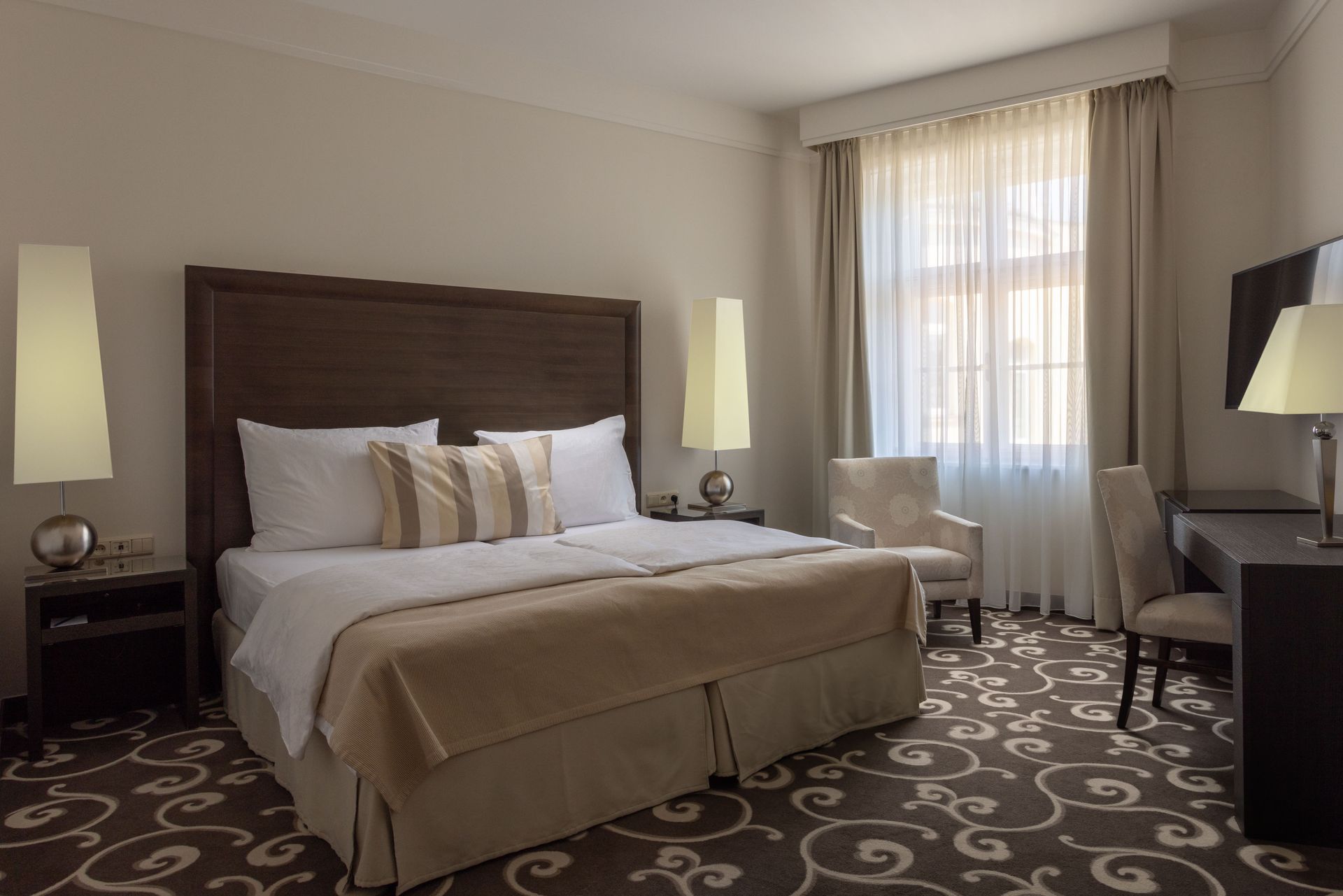 The double rooms are equipped with elegant dark furniture and offer a king-size double bed or two twin beds.