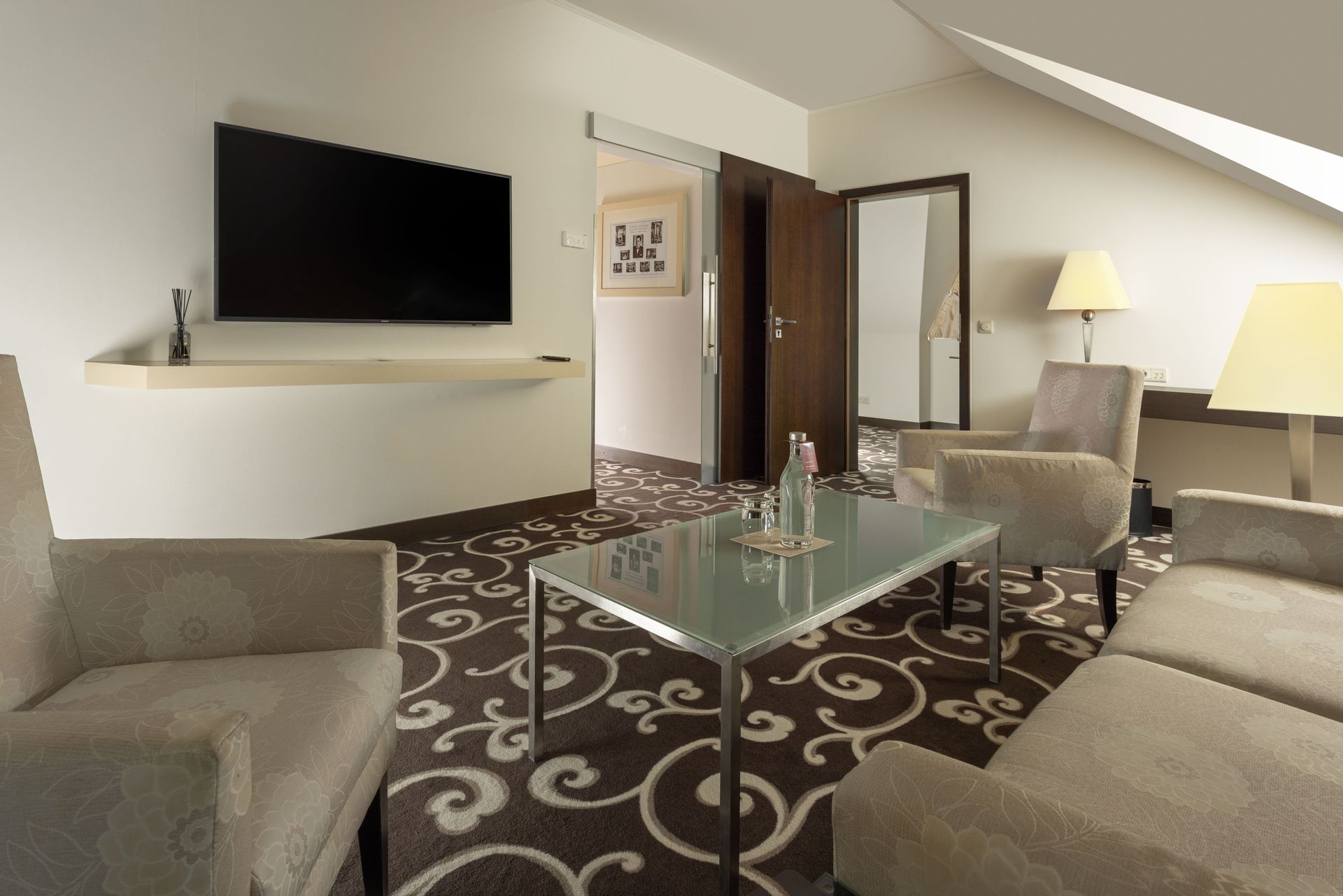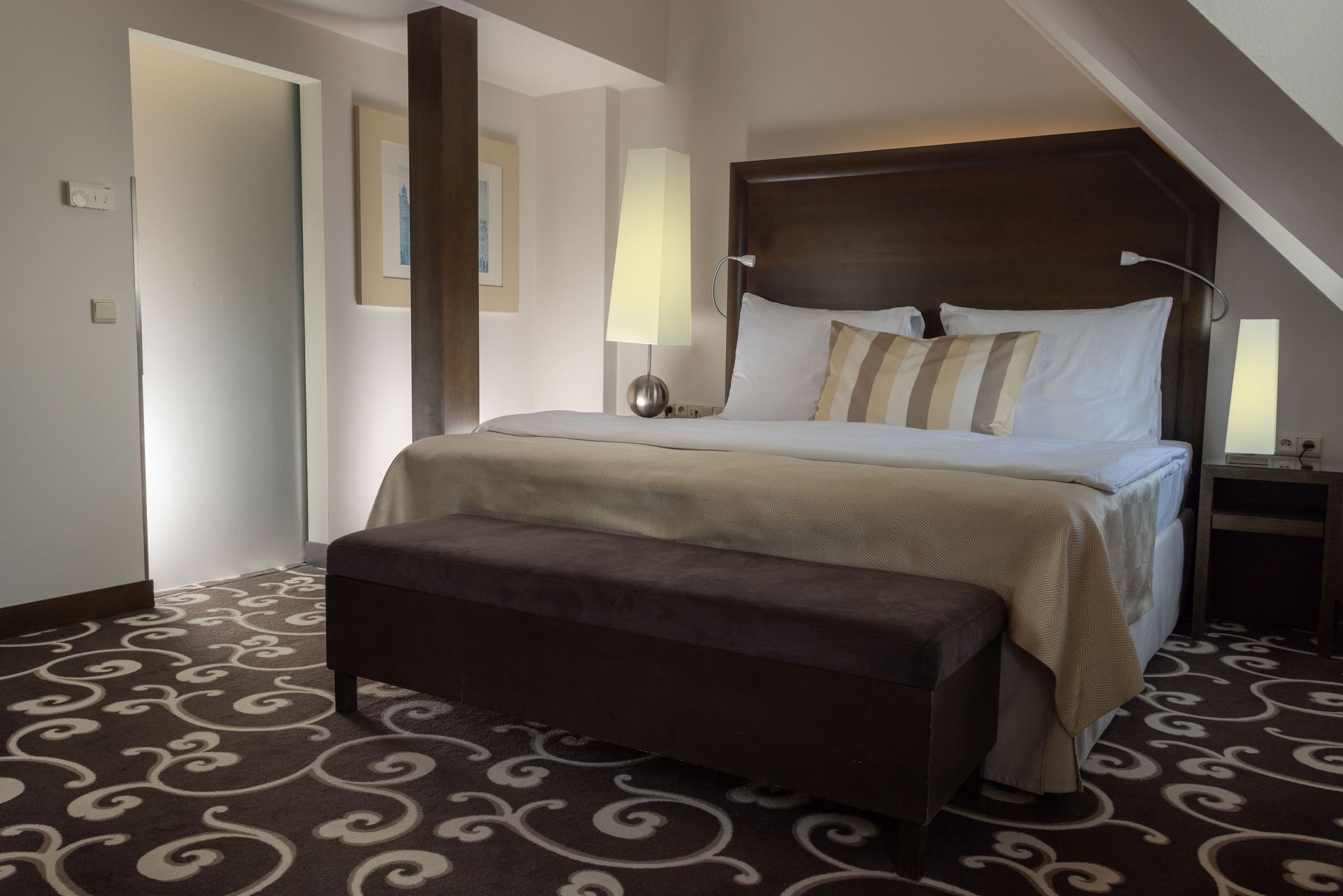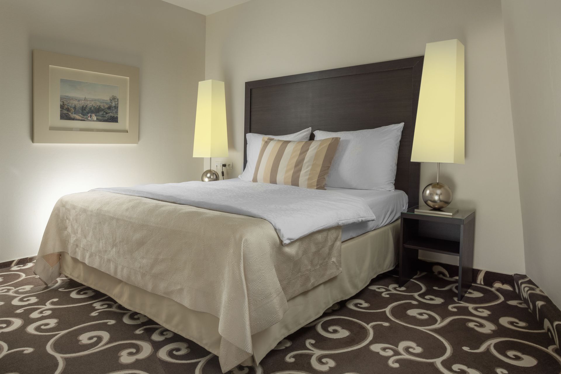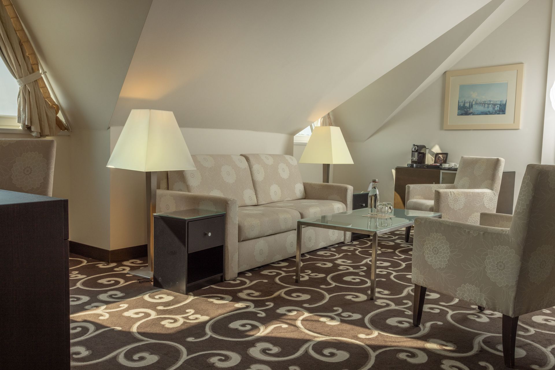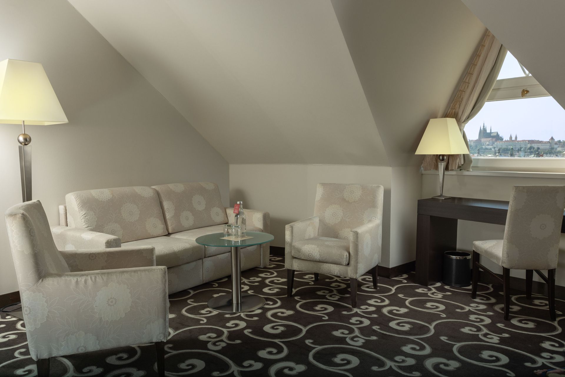 This Suite is located on the 8th floor and offers a unique view of the prominent Powder Tower. The room is equipped with a king size bed and a folding sofa set in the living room.