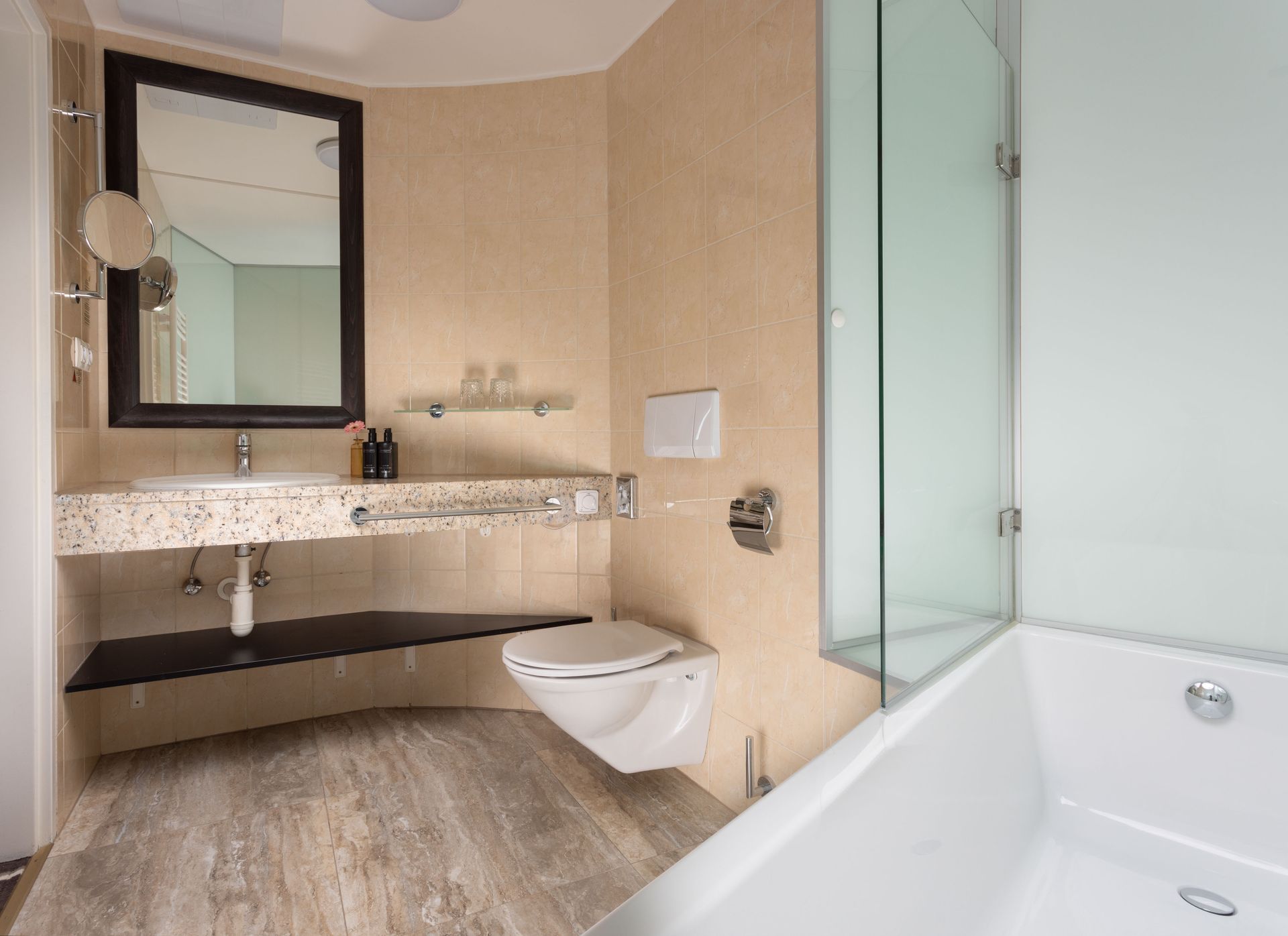 The luxurious, spacious bathrooms are all equipped with a bathtub and a massage shower, a hairdryer, bathrobes, a personal scale, a cosmetic mirror and cosmetic accessories.