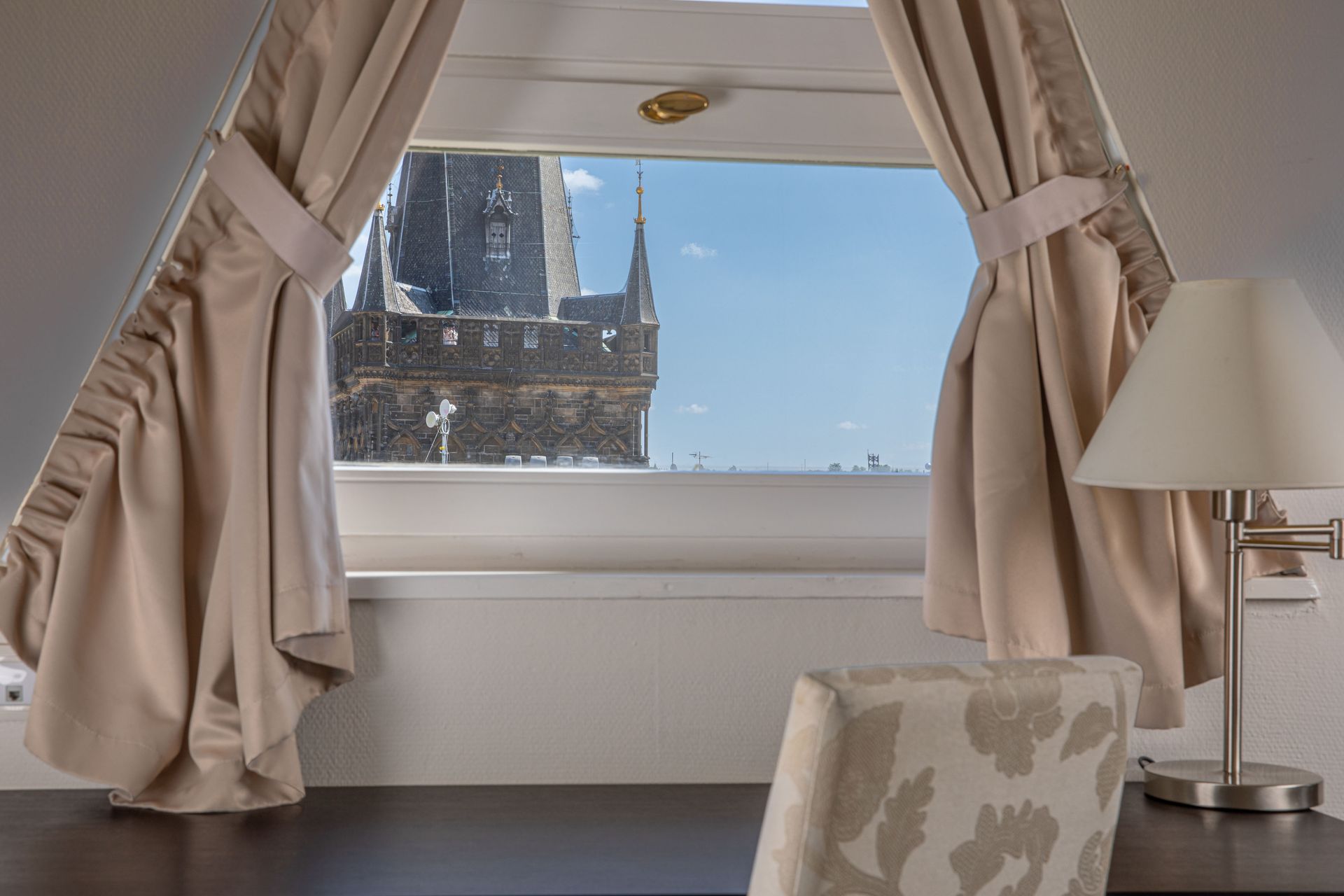 The rooms offer views of Prague red roof tops, the nearby Powder Tower, or view of the Old Town.
